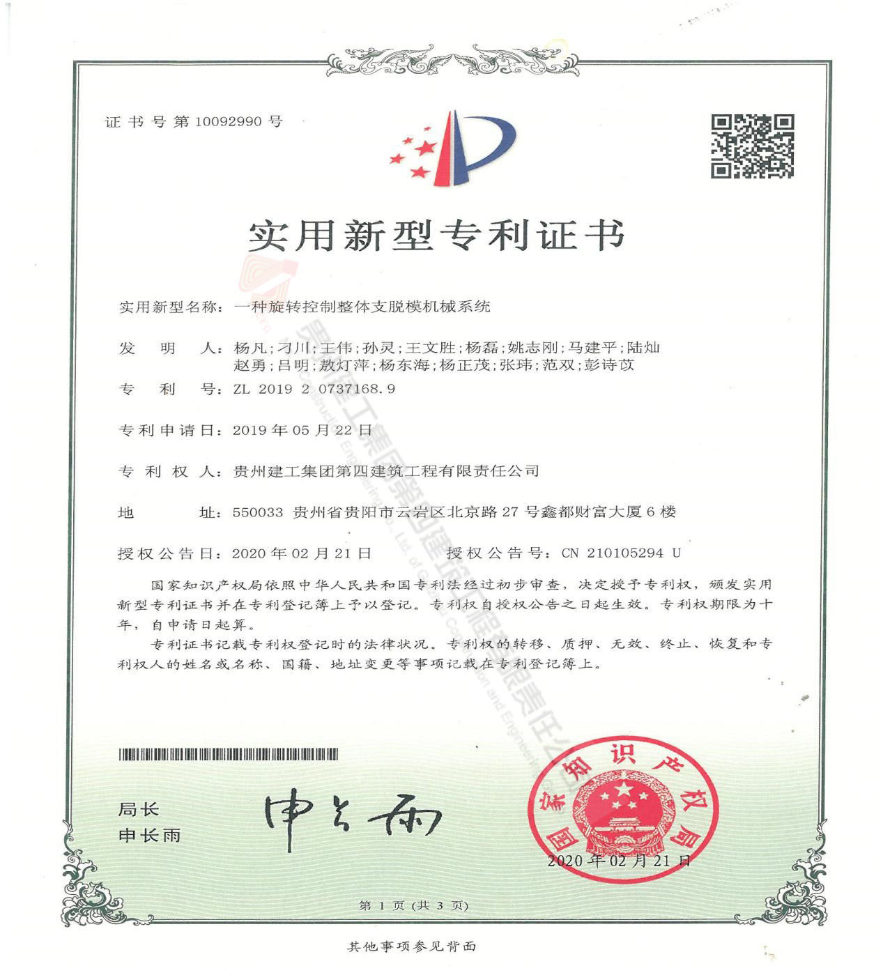 《一种旋转控制整体支脱模机械系统》,包括主旋转轴,筒体内模板沿该主旋转轴四周架设构成方柱形的模板体系;在该主旋转轴上间隔设有若干个拉伸传动装置,拉升传动装置通过设置在其四个方向上呈十字交叉的关联传动杆与筒体内模板连接;在所述主旋转轴上还设有摇柄,摇柄通过人工或机械动力实现将主旋转轴的旋转;筒体内模板的四个角拼接处设有橡胶充气收分角模。本实用新型利用拉伸传动装置的椭圆盘的弧形槽的结构特点,在旋转主旋转轴时使关联传动杆端头的钢球沿弧形槽中滑动,由于椭圆盘的结构特点,钢球在弧形槽中不同的位置时关联传动杆与筒体内模板之间的间距不同,从而可以向外推动筒体内模板或者向内收缩松开筒体内模板。该专利获2020年“国家实用新型专利”