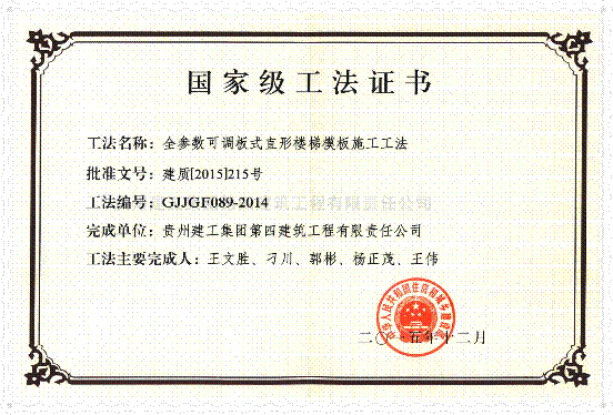全参数可调板式直形楼梯模板经过近年来多个工程的探索、实践,在先后发明《可调节式通用楼梯模板》、《可重复周转使用的楼梯模板》、《一种新型的可滑动式卡件》、《用于斜模板的球头连接支撑构件》等专利的基础上不断改进设计的一套专用钢构件,总结形成了《全参数可调板式直行楼梯模板施工工法》。解决了不同房屋设计带来的各种楼梯参数尺寸(包括踏步面高、宽及梯段长、宽以及梯段板厚等)的变化、与各种主结构能够整体无缝浇筑,以及长期以来楼梯模板主要还处于现场就地取材,人工制安及拆除状态,费工、费料,质量和工艺还难以控制的问题,在保证安全质量及工艺的同时,即能加快施工进度,又能节约施工成本。工法荣获 “2012-2013年度贵州省级工法”,“2013-2014年度国家级工法”。