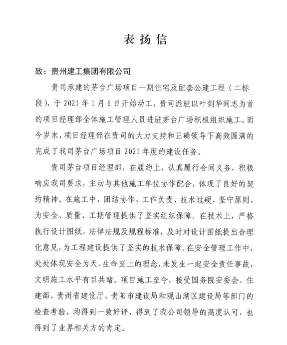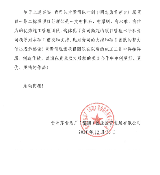 近日,贵州茅台酒厂(集团)置业投资发展有限公司向贵州建工集团有限公司发来了感谢信,对施工方在建设过程中付出的辛勤努力和做出的工作业绩给予了充分肯定及高度赞扬!