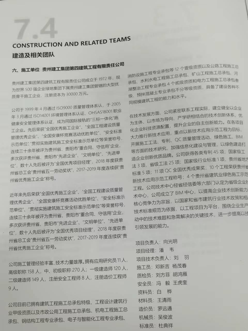 全书共239页,贵州建工集团四公司作为该项目的建造和团队独立成篇,就企业的基本概况、资质成就、人才队伍、技术创新、获奖情况以及项目团队相关成员等进行了介绍。
