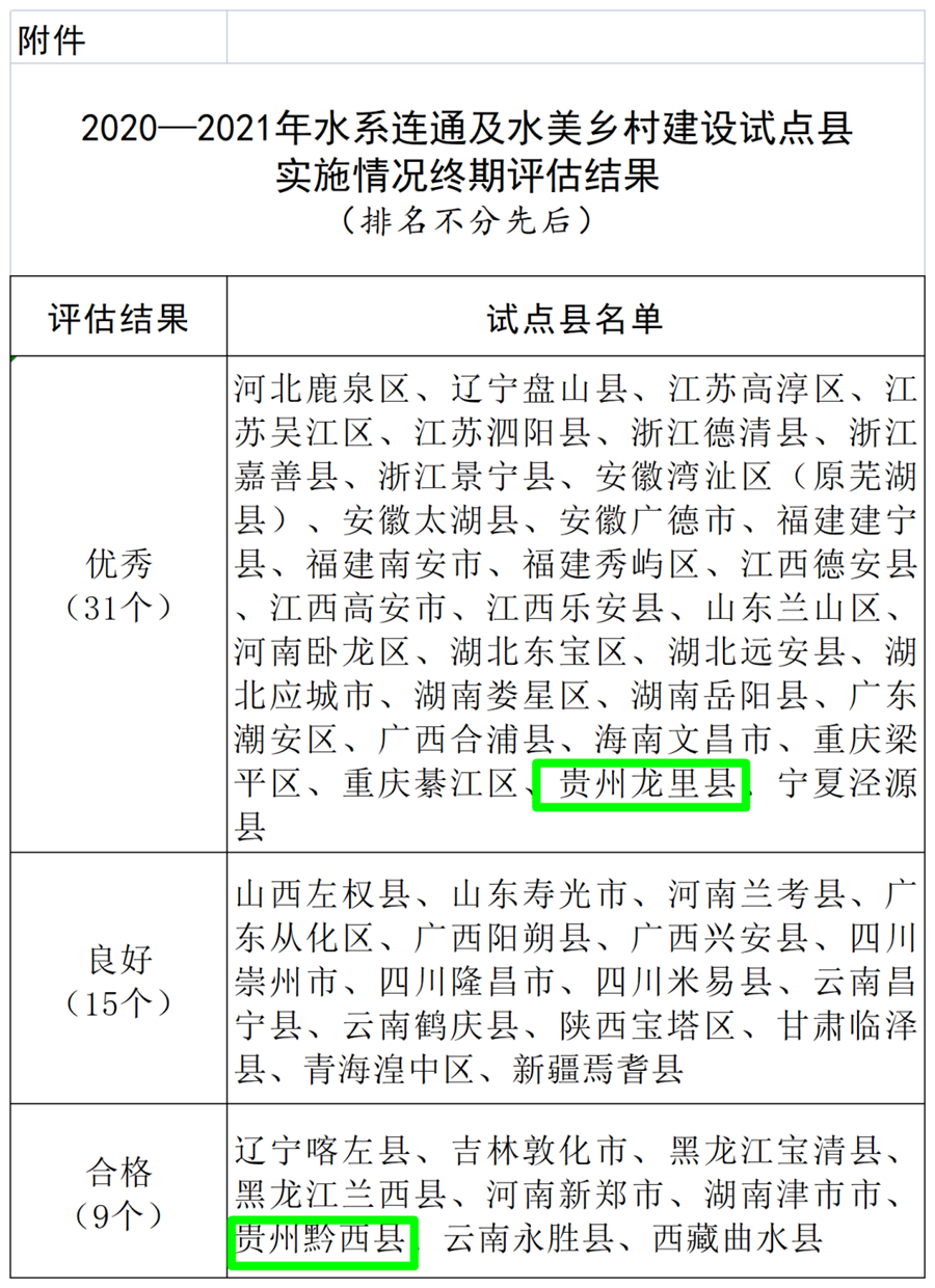 近日,水利部、财政部办公厅联合下发《关于公布2020—2021年水系连通及水美乡村建设试点县实施情况终期评估结果的通知》,贵州省龙里县被评为2020—2021年水系连通及水美乡村建设优秀试点县。