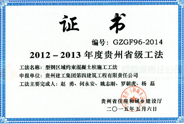 我司在工程实践的基础上,利用发明专利“一种钢筋弯箍机”及“用于钢筋混凝土施工中定位方法及定位器”的专用设备及定位方法结合BIM技术,总结形成了《型钢区域约束混凝土柱施工工法》,解决了柱节点钢筋在平面、空间的精确定位难、约束箍筋几何尺寸、安装位置、钢筋保护层厚度不好控制等技术难题,在保证工程质量的同时还能提高加工和安装速度、降低劳动强度。工法荣获 “2012-2013年度贵州省级工法”,“2013-2014年度国家级工法”。