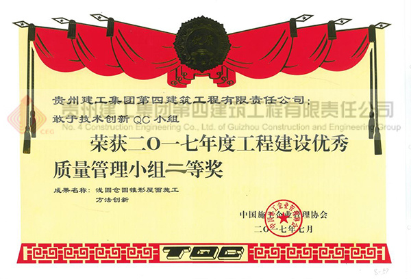 2016年9月,公司及项目部成立贵州建工集团第四建筑工程有限责任公司敢于技术创新QC小组,就浅圆仓圆锥形屋面施工中存在的一些技术难题进行分析,重点解决现有施工工艺存在的施工成本相对高、周转工期长,工程质量不易控制的现象。经过技术创新,提出了升降式圆锥形钢支架模板支撑受力体系,该体系作为一种针对圆锥形屋面混凝土模板支撑系统,通过具有良好约束的圆锥形桁架承载上部混凝土和模板荷载,由桁架主体、桁架升降、支撑结构组成。其结构受力合理、简单、易于操做、可重复周转,成功应用在我司西南粮食城项目上。极大的降低施工工程成本,有着良好的社会效益和发展前景。QC小组荣获中国建筑业协会2017年度全国工程建设质量管理小组活动优秀成果二等奖以及中国施工企业管理协会2017年度全国工程建设优秀质量管理小组二等奖,我司获得2017年度全国工程建设QC小组活动优秀企业称号。
